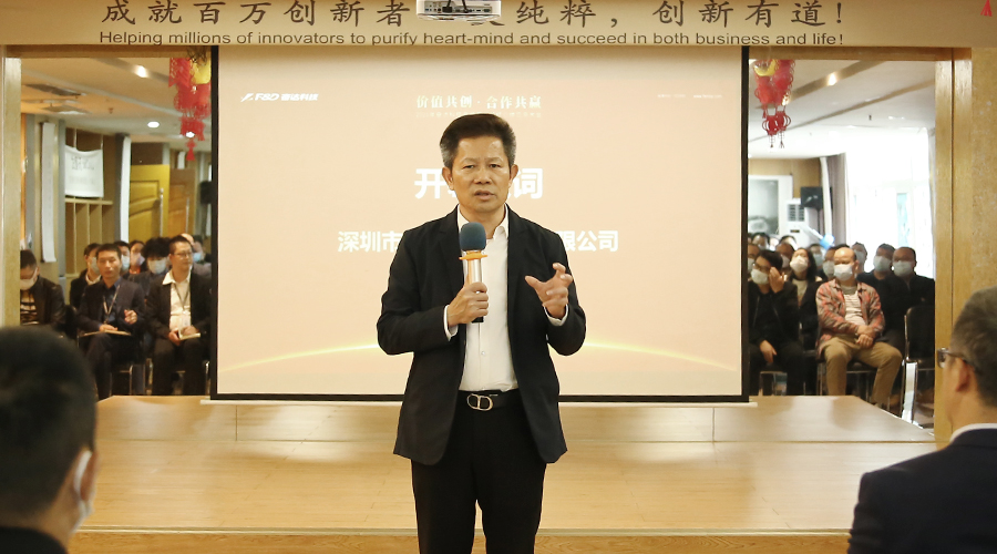 肖奋董事长致开幕词,他首先对各位嘉宾及供应商代表的到来表示热烈欢迎并对大家一直以来的支持致以真诚谢意。会上,他总结了公司近两年来的发展情况,尤其是2021年以来,面对新冠疫情、芯片短缺、大宗商品原材料价格剧烈波动等严峻挑战,整个行业都危机重重,然而UG环球科技在供应商朋友们的互相支持下,一起携手奋进、共克时艰,使得经营收入保持了持续增长,在困难重重中取得了较好的成绩。