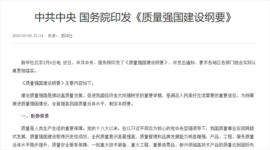 今年2月,中共中央、国务院印发了《质量强国建设纲要》(下称:纲要),旨在统筹推进质量强国建设,全面提高我国质量总体水平。文件表示建设质量强国是推动高质量发展、促进我国经济由大向强转变的重要举措,未来将推动健全质量政策、加强全面质量管理、促进质量变革创新。