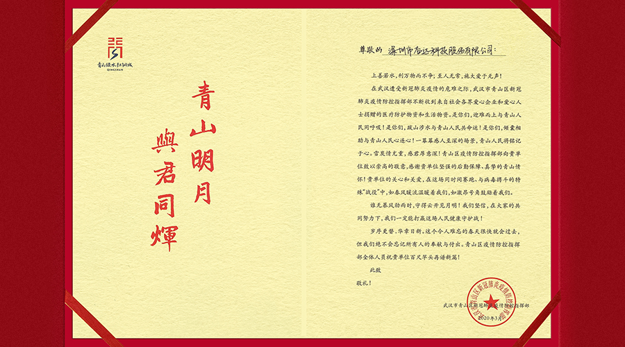(武汉青山区新冠肺炎疫情防控指挥部给UG环球科技的感谢信)